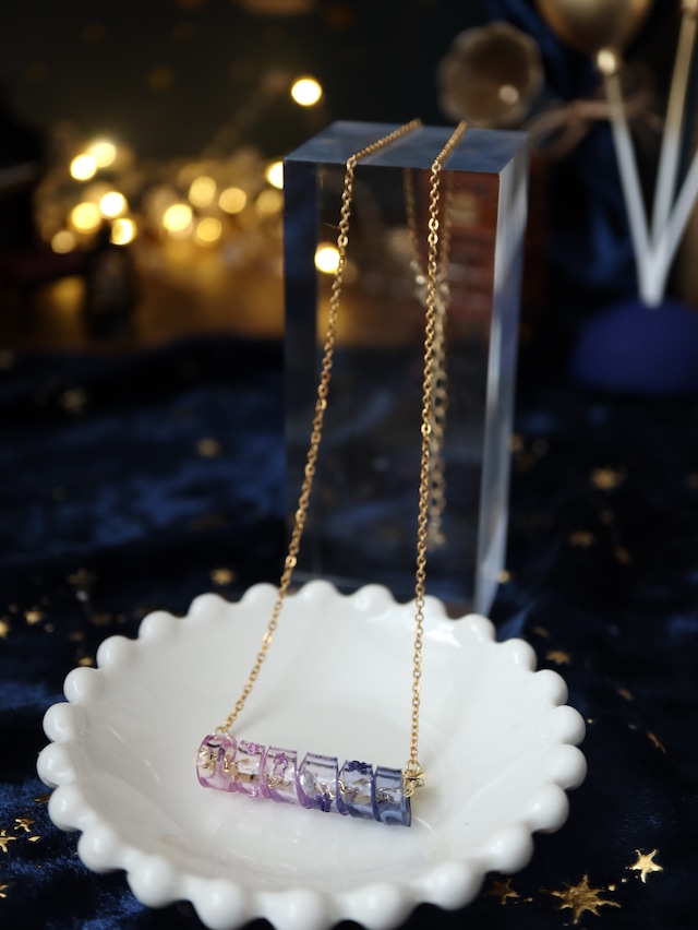 熱でくるりと曲げたアクリルを、幻想的なグラデーションに染め上げ、空中でほどけるシルクのしなやかな動きを表現しています。
