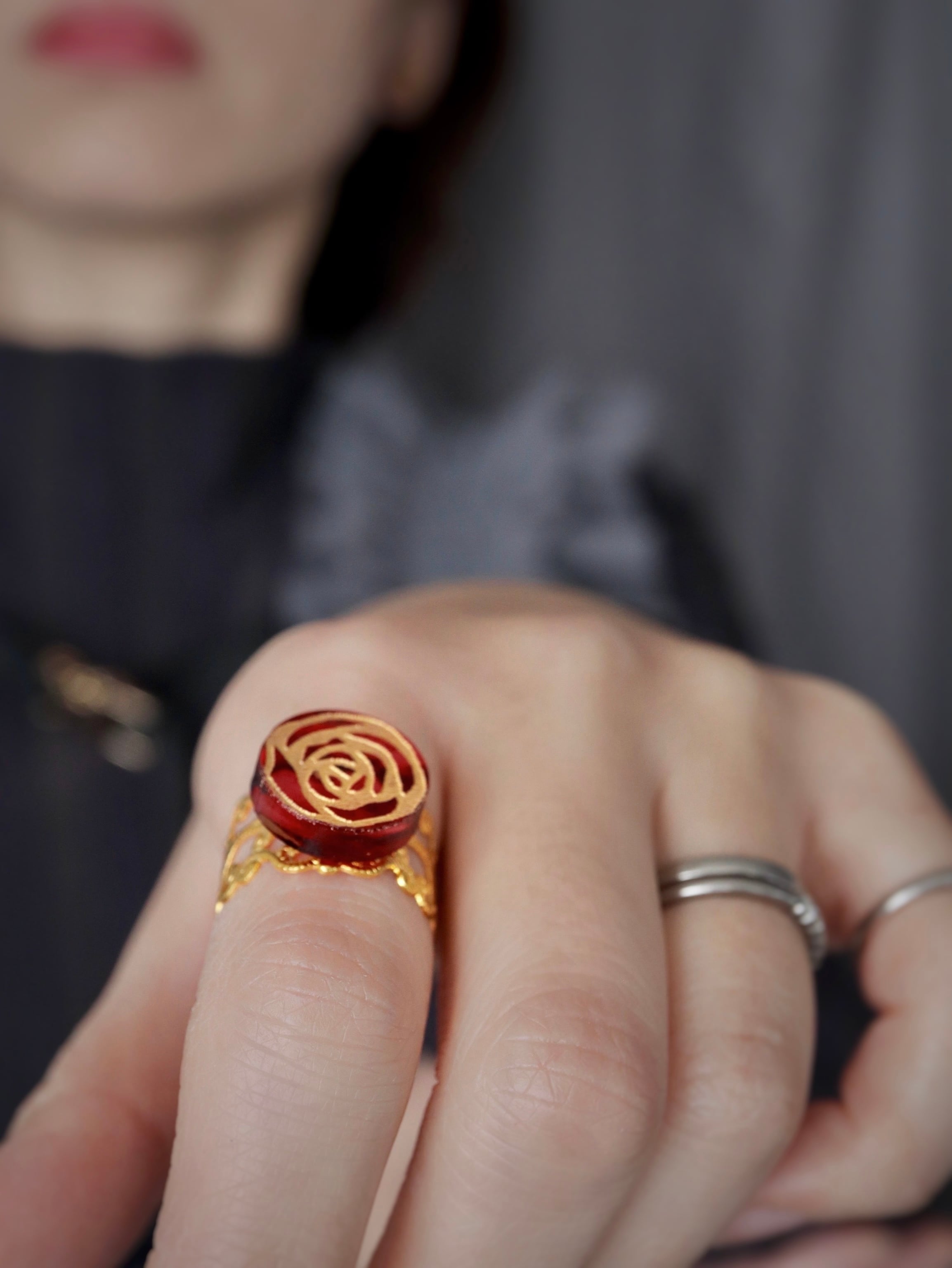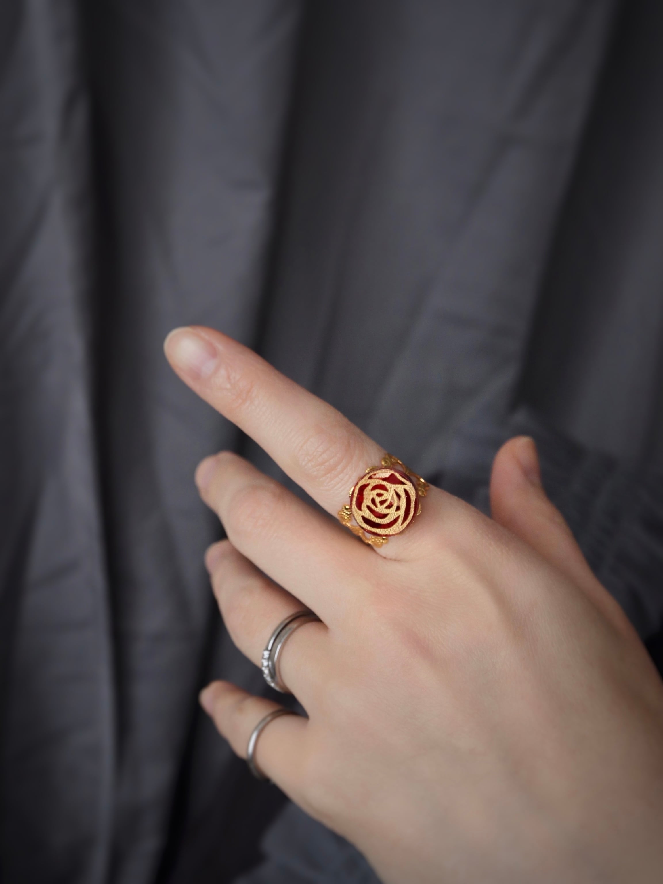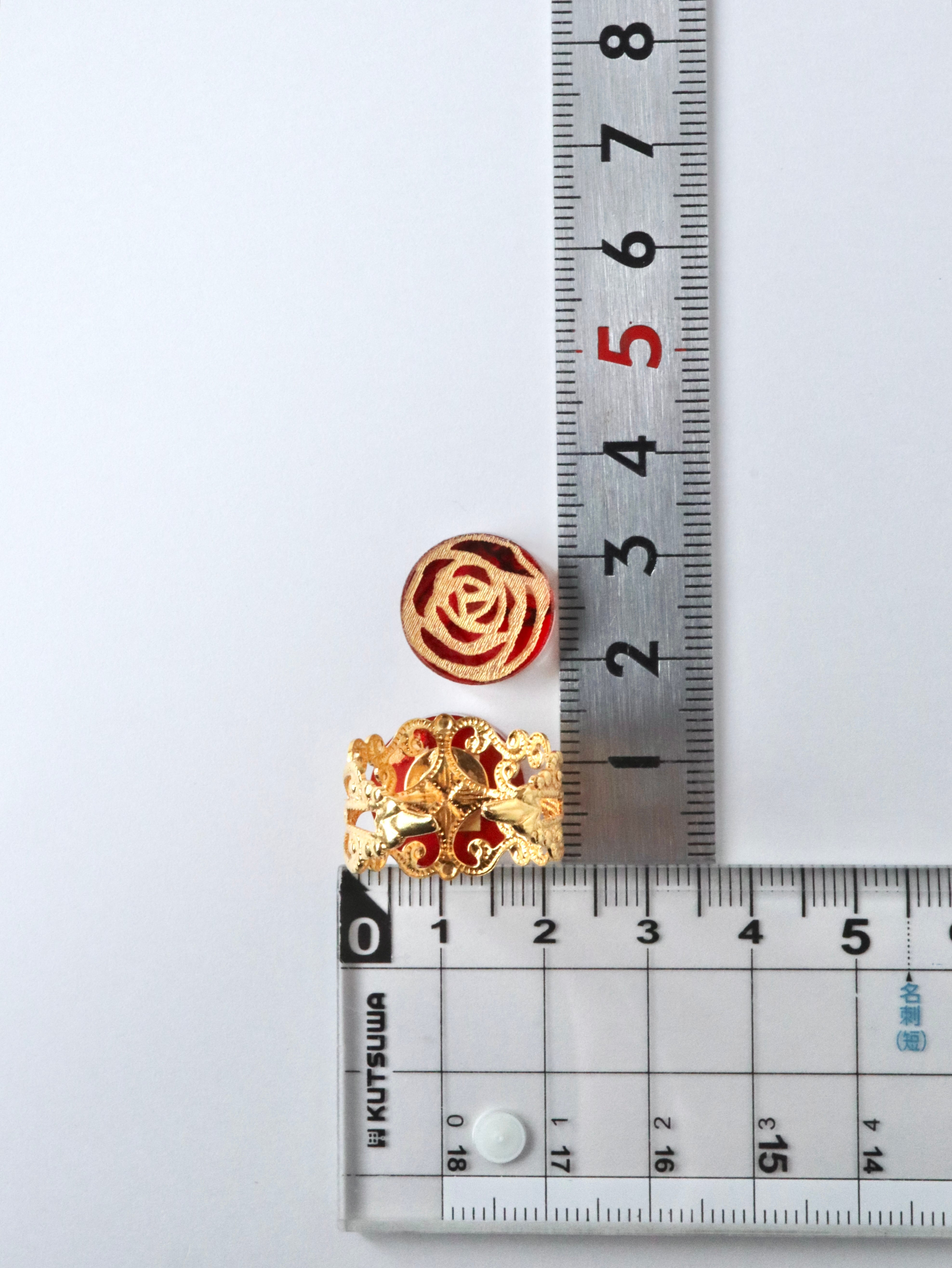 深く燃えるような赤に、あたたかなゴールドの彫刻を重ねました。