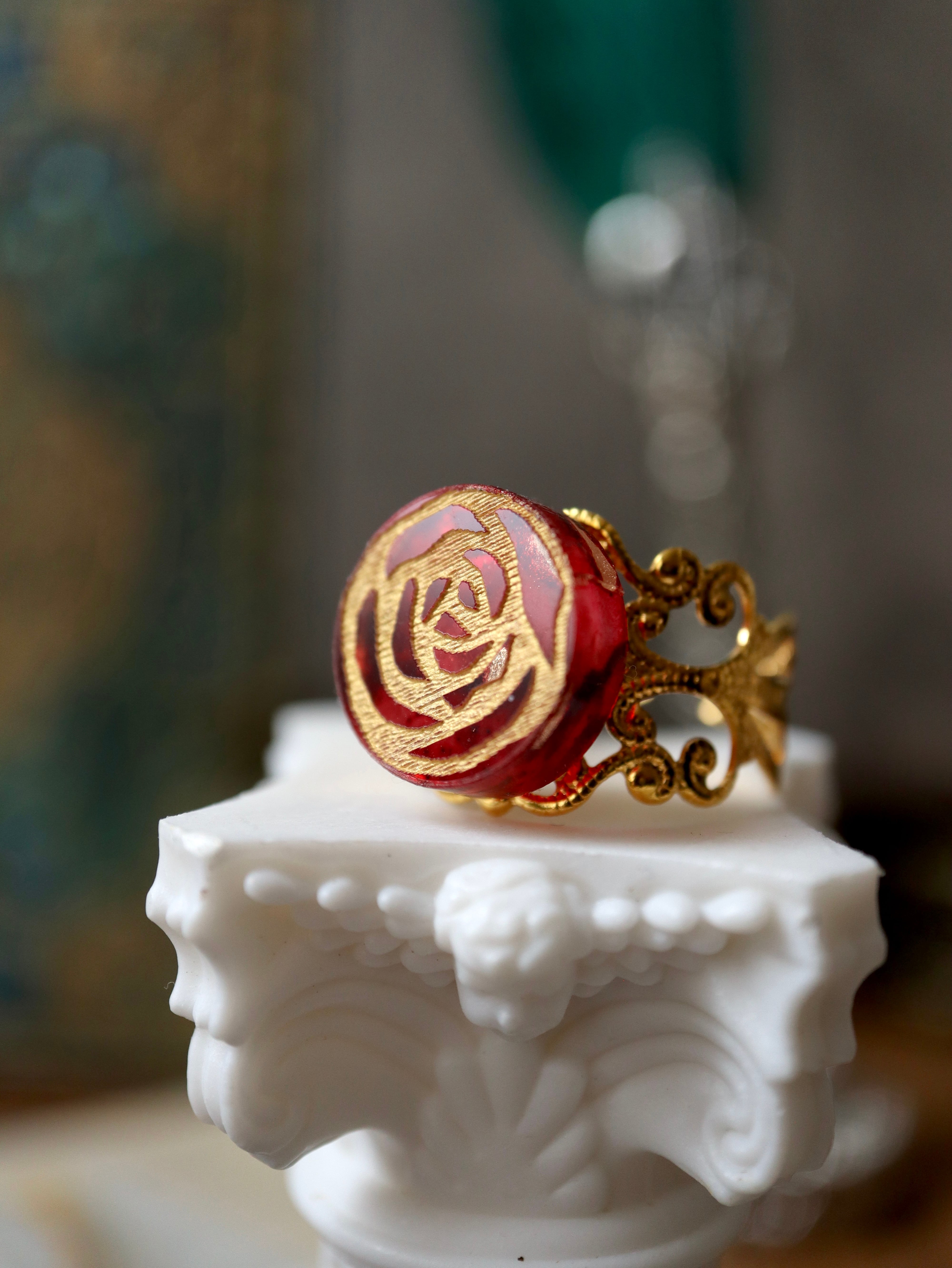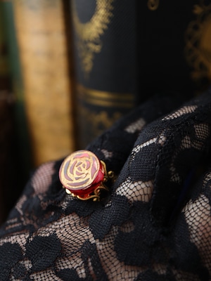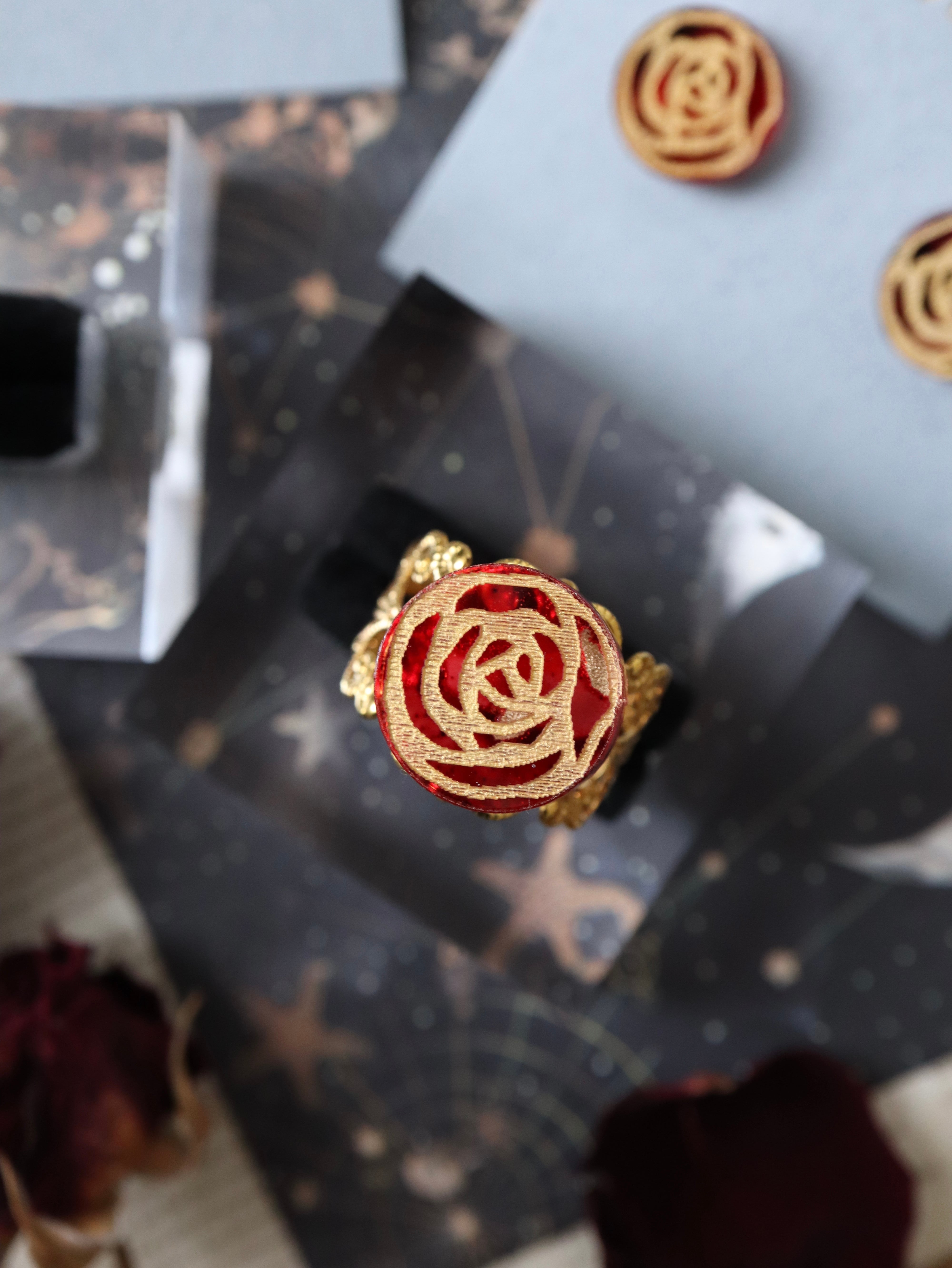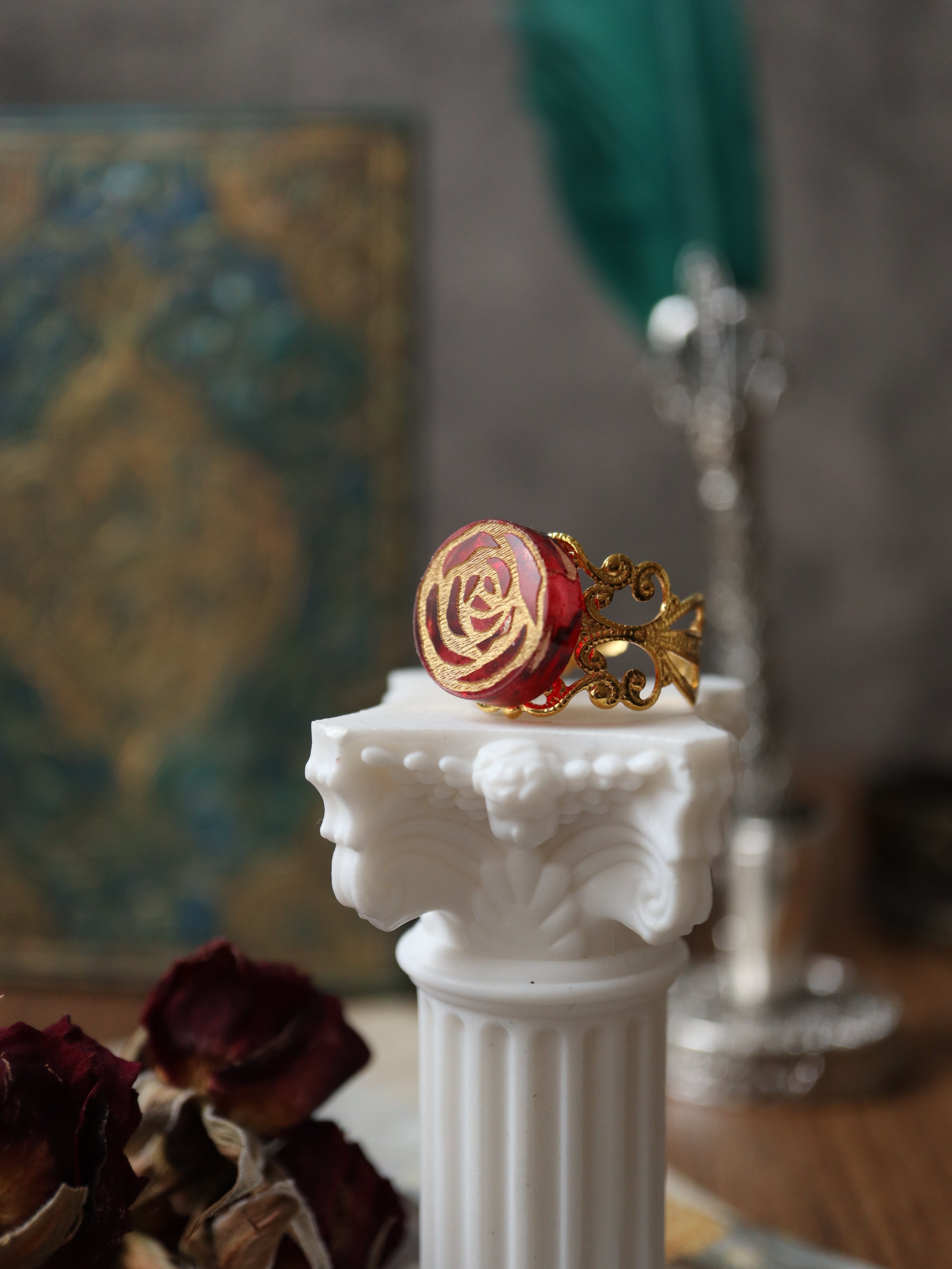深く燃えるような赤に、あたたかなゴールドの彫刻を重ねました。