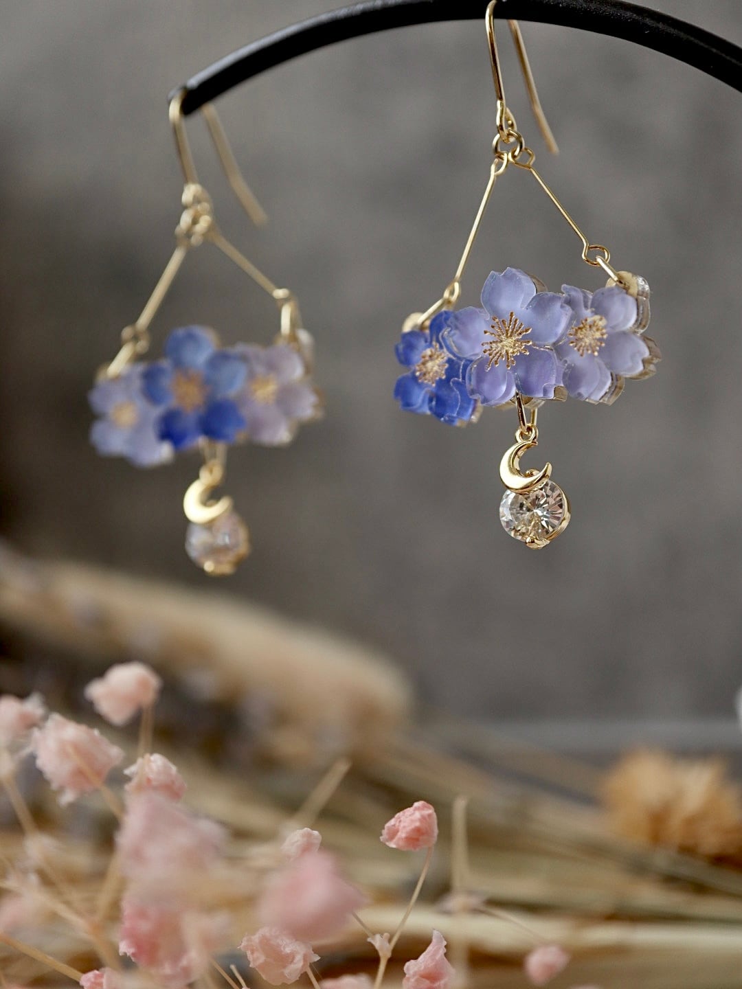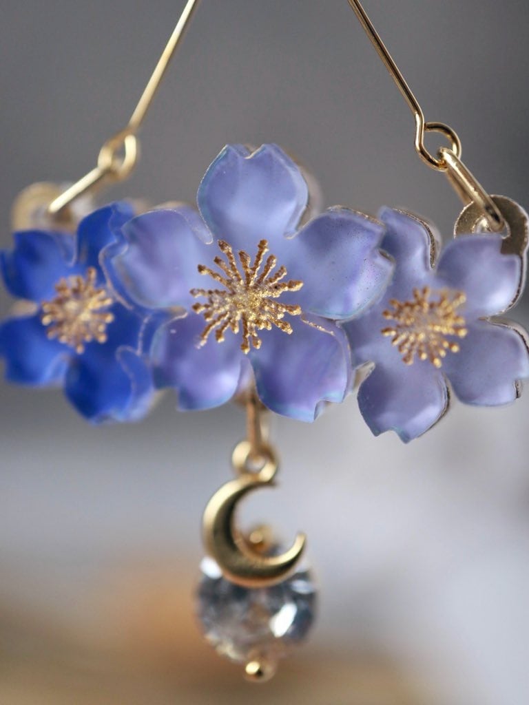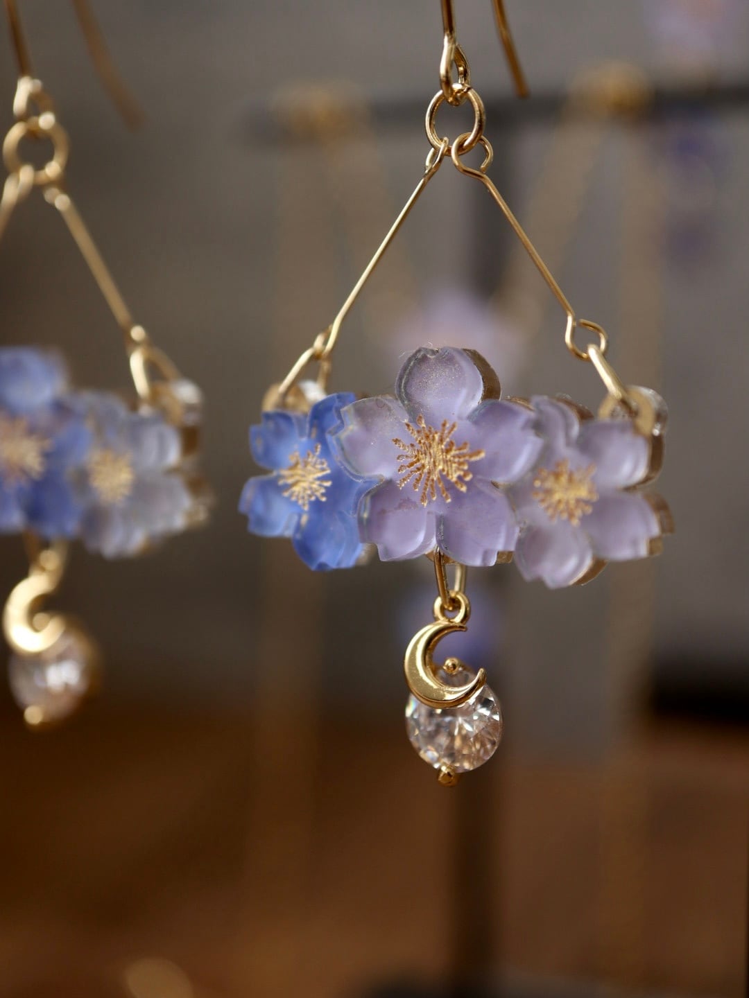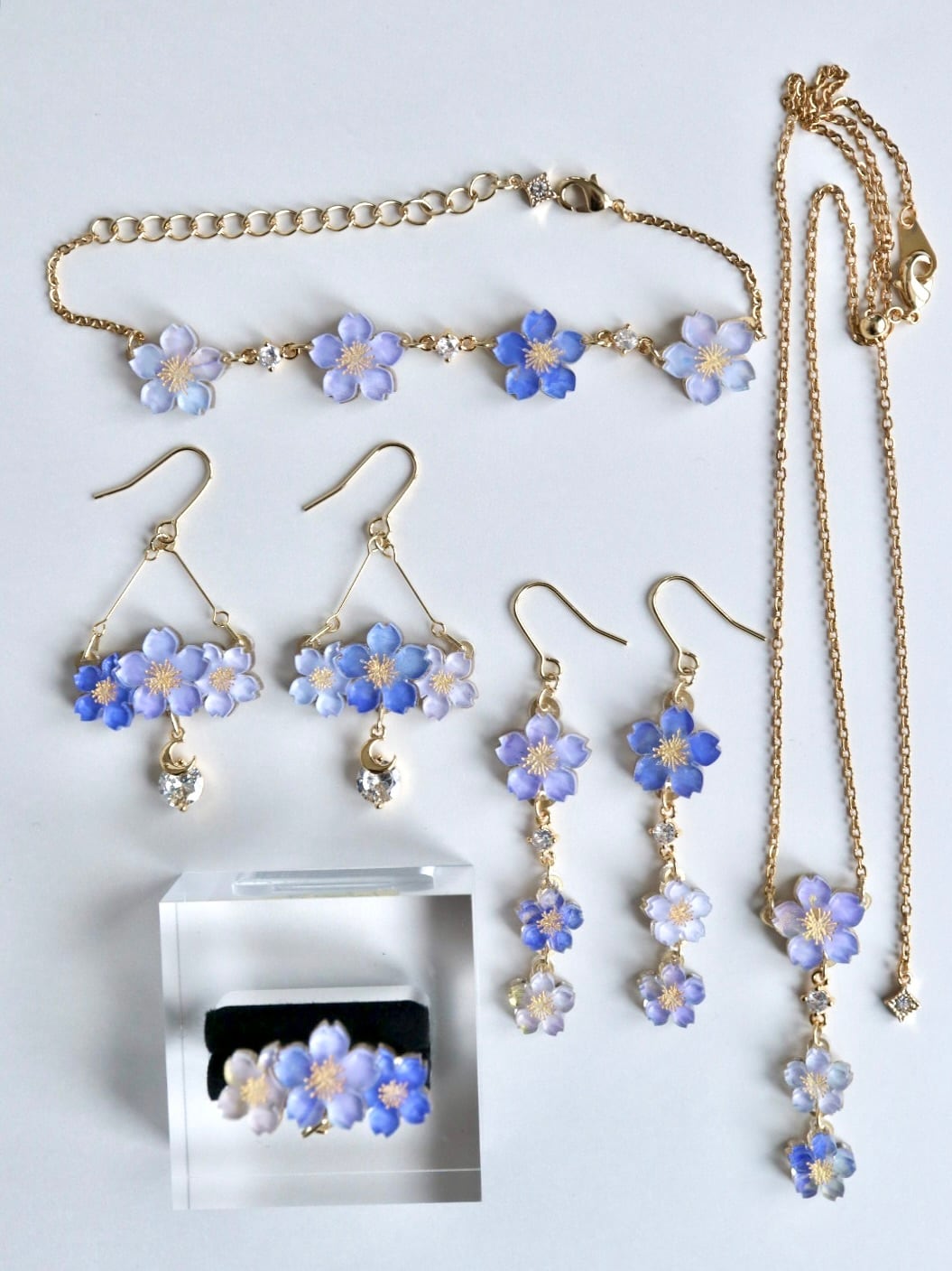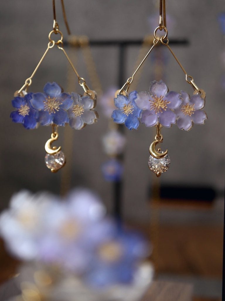 三日月と透明なクリスタルのチャームを組み合わせ、幻想的な庭園で桜が静かに揺れる情景を表現しました。