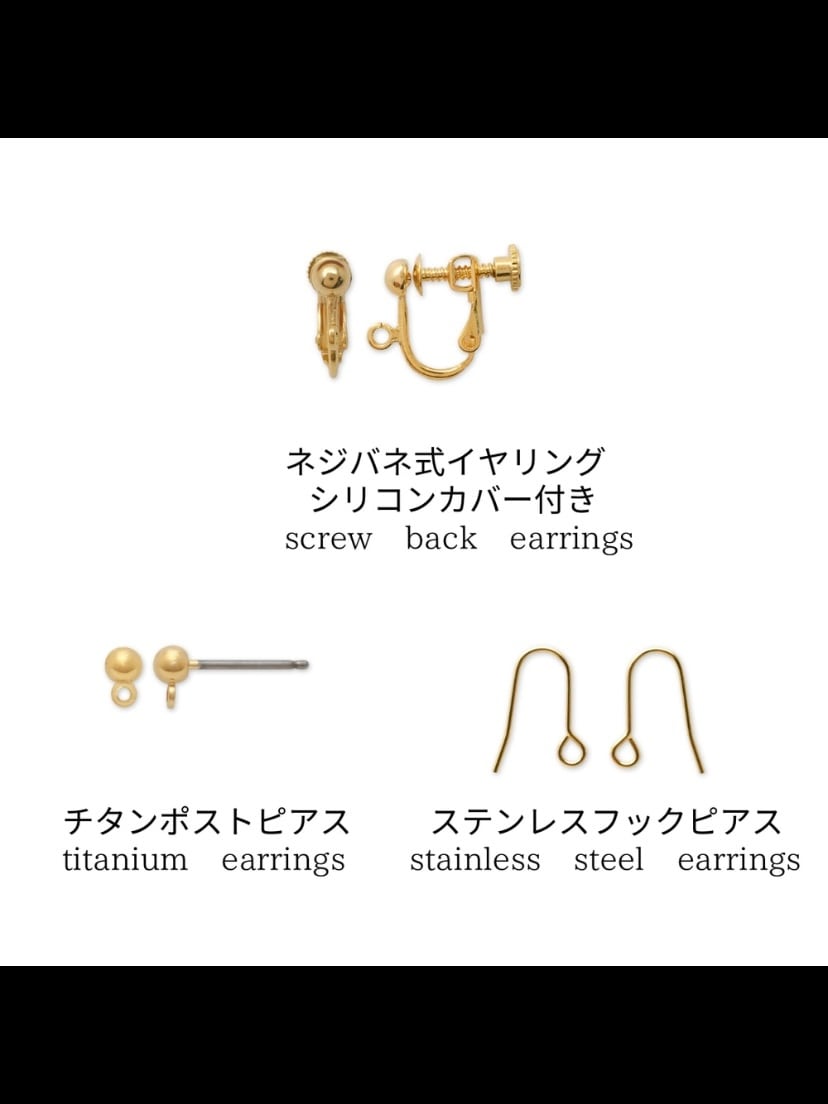 金具は①ネジバネ式イヤリング②チタンポストピアス③サージカルステンレスピアスの3パターンからお選びいただけます。必ずいずれかをご選択ください。